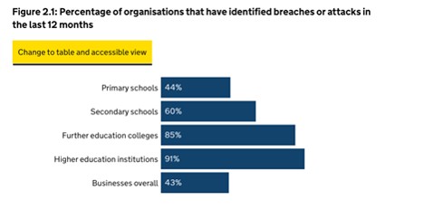 According to the Cyber Security Breaches Survey 2025, 91% of higher education institutions reported experiencing a cyber security breach or attack in the last 12 months. This compares to 85% of further education colleges and notably lower figures across primary and secondary schools.